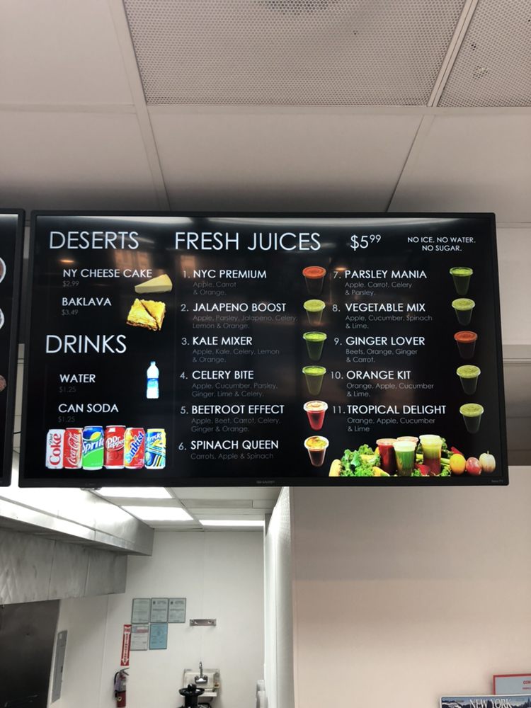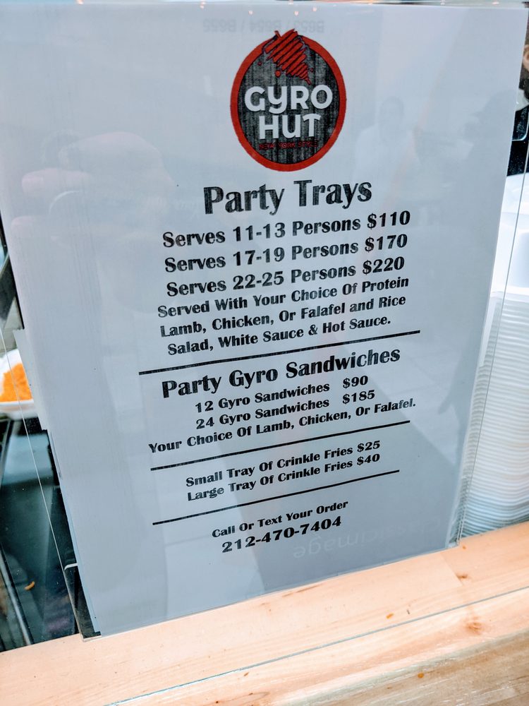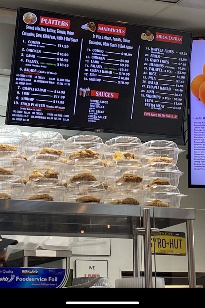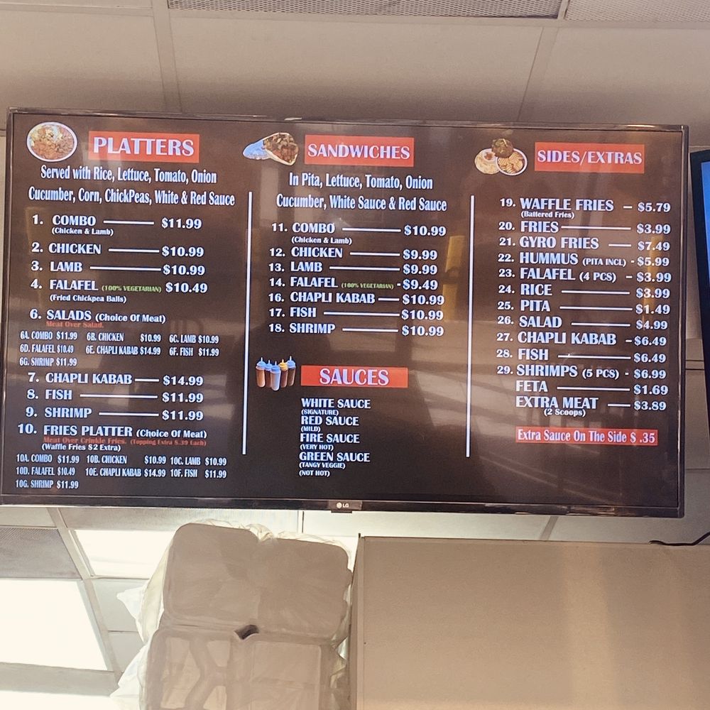 Served with rice, Romaine lettuce, tomato, onion, cucumber, (2) white sauce and (1) hot sauce.